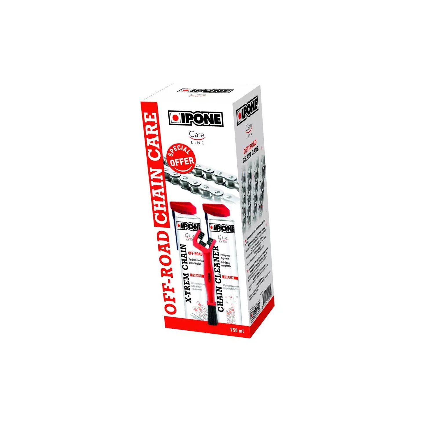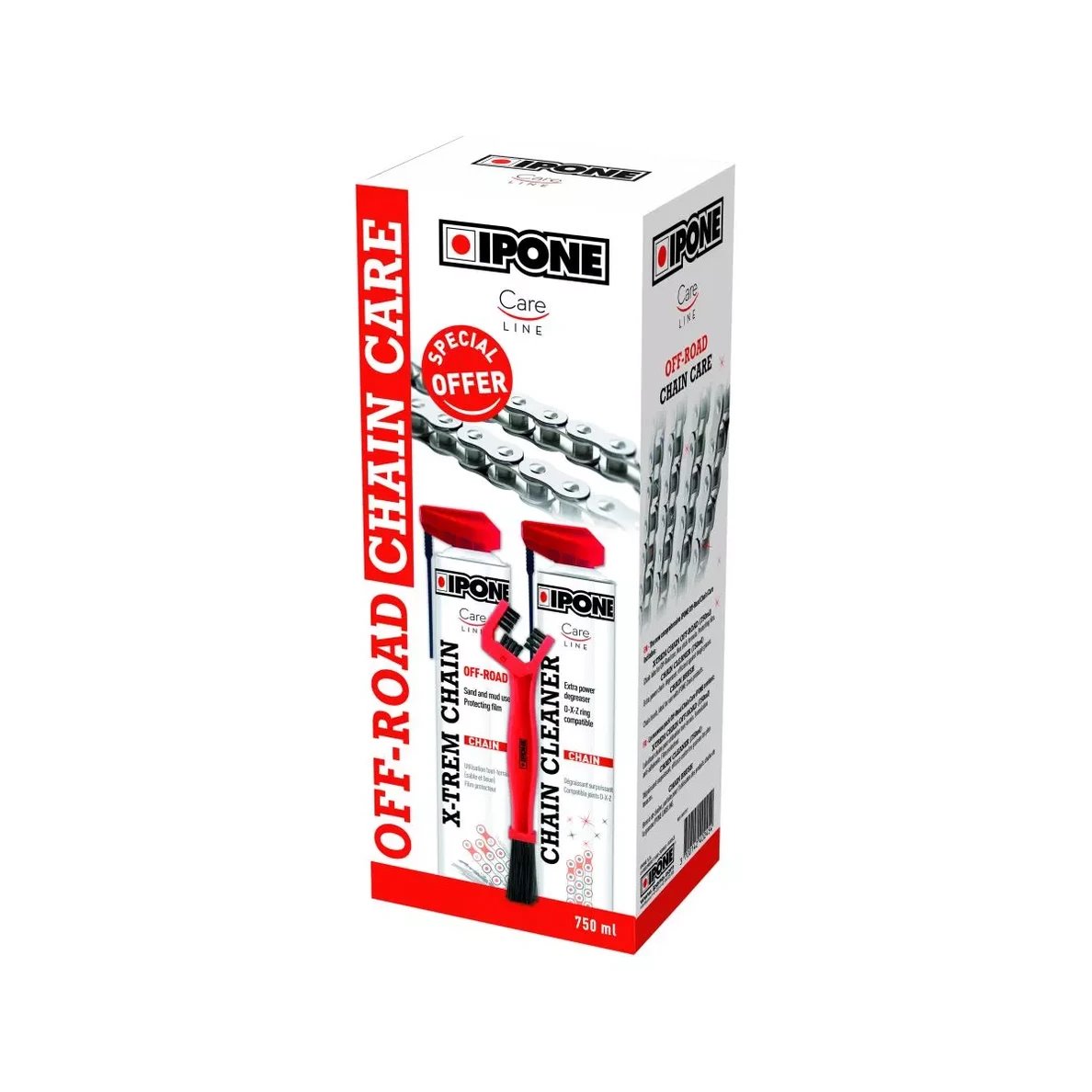 Zestaw IPONE OFF ROAD CHAIN CARE to kompleksowe rozwiązanie do pielęgnacji łańcucha napędowego, dedykowane motocyklom terenowym. Składa się z dwóch pojemników po 750 ml – jednego ze środkiem do czyszczenia łańcucha, a drugiego ze smarem, oraz dedykowanej szczotki. Zapewnia skuteczne usuwanie brudu i optymalne smarowanie, przedłużając żywotność łańcucha w trudnych warunkach.